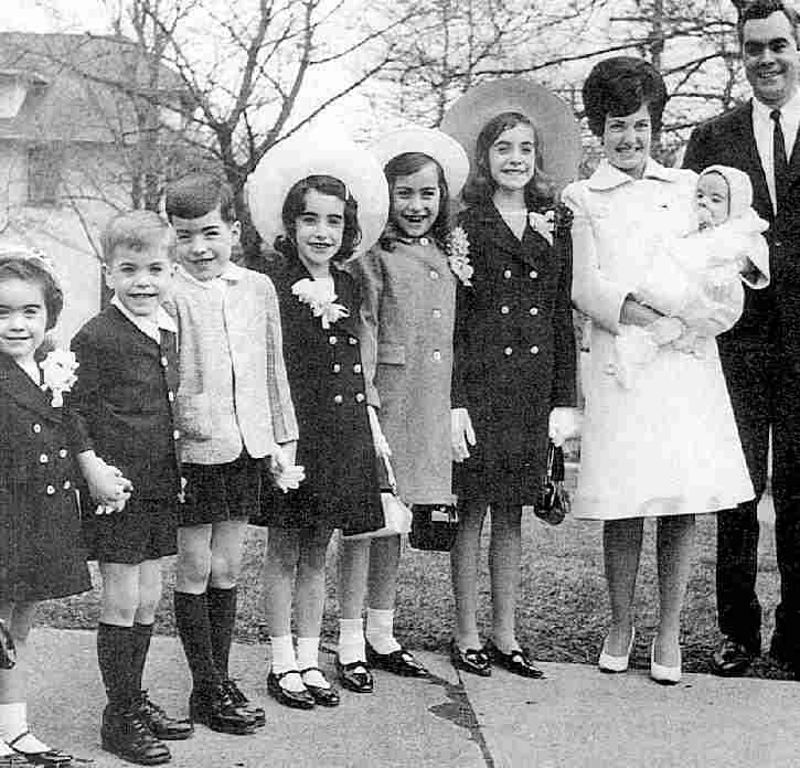 Here we have a family Easter portrait taken in 1966. It is traditional to buy new Spring outfits for Easter. Here we see the seven Casey children are all done up in fancy new Easter outfits. The family lived in Philkadelphia, Pennsylvania. The children are Erin, Chris, Bobby, Kate, Mary Ellen, and Margi. The baby is Pat. An eight child would follow later. I am guessing the family is Catholic. The girls wear very large wide-brimmed hats. The boys wear Eton suit outfits. Curiously Chris wears an Eton suit either navy blue or black with a Eton shaped collar. Bobby, his older brother, wears an Eton sports jacket with a Peter Pan collar. Both wear matching short pants and kneesocks. Neither boy wear a tie. They look about 5-6 years old. The parents are Ellen and Robert Casey. He would lose an election for Pennsylvania govenor in the Fall election, but he was later elected in the 1980s. A California reader writes, "The regional differences are an interesting reflection of the degrees offormality in different places. I see the family was from the Northeast. I think this is a good example of regional differences in America. I don't believe that partents here would have dressed their children like this in the 1960s."