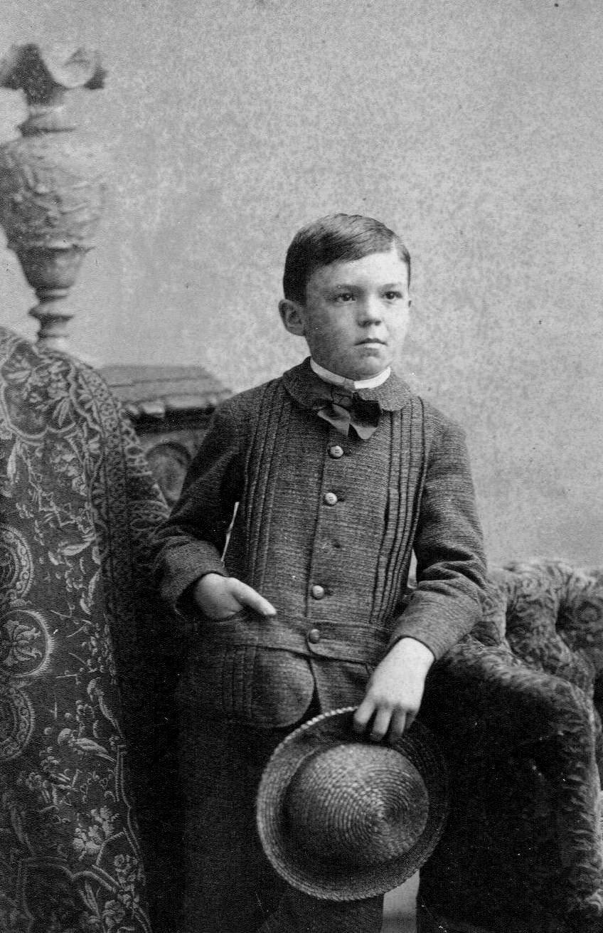 Eight year old boys continued the basic pattern of school age boys. Boys about 6-12 years old wore basically the same styles of headwear with some limited differences. They wore tri-corner hats like their fathers in the 18th century. There may have been other headwear, especially on the frontier, but there were no deducated boys styles. Our information on the early-19th century is very limited. We note Oliver Twist caps which was a Napoleonic War military style, but continued popular into the 1850s presumably because the U.S. Ary adopted it. We notice Scottish style caps after mid-century, but these were motly worn by boys from affluent families and were not very common. Much more common in the 19th century were rounded crown hats. The boy here is wearing one, we think in the 1880s (figure 1). We note boys wearing kepis during the Civil War year and the 1870s. And as sailor suits became popular we begin to see boys wearing sailor headwear. At age 8 years, the caps seem more common than the hats, but we see some 8-year old wearing sailor hats, although they were more common for younger boys. At the end of the century we see 8 year olds wearing a variety of caps. This continued after the turn-of the 20th century. Flat caps emerged as the standard cap style (1910s). The flat cap declined in popularity (1930s), but not cap style was nearly as popular. Some boys from afluent families wore peaked caps. After World War II, baseball caps became increasing popular. Some older boys wore adult-styled hats when dressing up, but this was not common with 8-year old. Headwear in general declined in popularity.