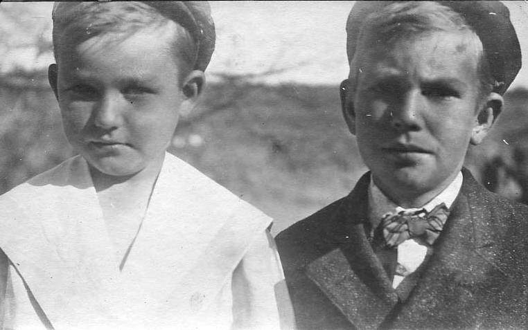 We see a few boys wearing flat caps with tunic suits. Thus was not very common, but we see a few examples. Flat caps were worn with other outfits such as the tunic suits that younger boys wore, but this was less common than suits or shirts and pants. This is probably because the flat cap was more common with older boys than younger pre-school boys. Here we see a younger brother wearing a flat cap with a tunic suit (figure 1). We suspectv having an oldr brither wearing a flat cap may have been a factor.