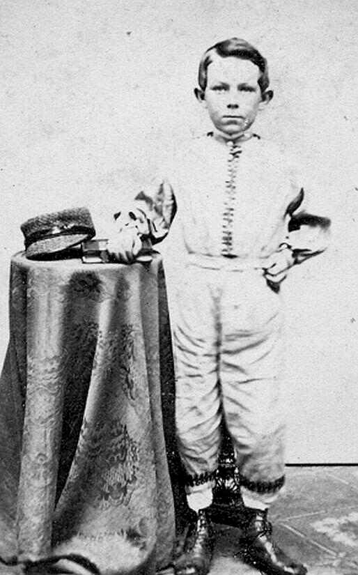 We blieve that these caps are basically a military style adopted by boys from the Napoleonic wars. These caps seem to be an European style adopted in America. Drawings suggest they wre worn with tunuc suits. We see drawings of boys wearing these caps in the early 20th century. With the advent of photography we can begin to assess thse caps more closely (1840s). We see boys wering these aps from the earliesr=t days of photography. A good example is an unidentified boy, wearing a tunic outfit, we think in the 1850s. And here we see a boy about 1865 wearing one of these caps (figure 1). It was not a particularly common style. We see more boys wearing other headwear styles. We do occassionally see it and see it often enough that it certainly was not a rare style. So far the examples we see most cmmonly come from the 1850s-60s. We have found severl examples in the 1890s. We continue to see examples at the turn-of the 20th century, but not much beyond the early 1900s.