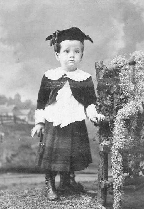 This little Amnerican boy was photography by Manley's Gallery, but we are unure about the city (figure 1). The portrait was probably taken about 1890. He wears a kilt suit with a Fauntleroy blouse. What we can't make out is his headwear. We think it may be a mortar board, but we are unsure. Note the tassles. He isd very young looking, perhps looking 2 years of age. That is younger thn most boys wearing kilt suits, the more modern pattern was that boys this age wore dresses and switched to kilt suits at about age 3 years or just before age 3 years. And of course in the 1890s, the centuries old convntion of youinger boys wearing dresses was beginning to end.