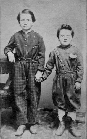 Most boys wore long pants, even most younger boys. Mosdt boys went straight from dresses after breeching to long pants. The shortened-length pants were still worn by younger boys. Most portraits we have found do not specify the ages. We suspect based on estimating the ages that the children wore the shortened-lerngth pants to about age 8 years. The lack of older boys weating shortened-length pants can be seen in school portraits. This is a little difficult to assess in individual portraits. We certainly do not see boys over age 10 wearing them. Portraits of brothers and families also show only the younger boys wearing-shortened-length pants.