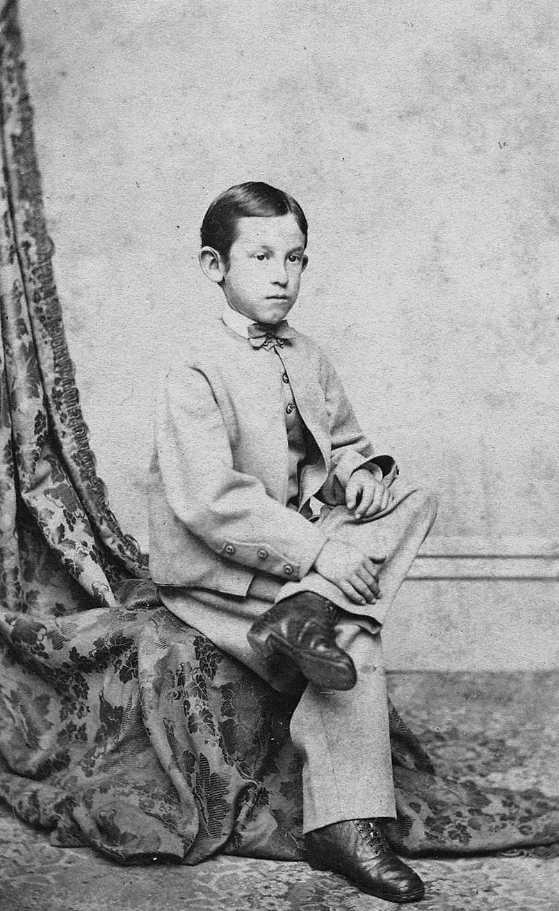 We note very young voys wearing long panrts in the 1960s. 8:16 PM 11/1/2020It was common at the time for younger boys to wear dressesc and the new kilt suits. The age at which children were breeched varied from family. This occurred for most boys somewhere between 3-6 years old. At which time, most boys began wearing long pants. A good example is C. Stewart, a very young by in 1865, perhaps about 4 years old. Another example is Ollie Vail,an American boy about 7-8 years old. Tge boy here looks to be about 8 years old (figure 1). An American school portrait in the 1860s show most of the boys wearing long pants. Another example is two American brothers, pribably about 5-8 years old. The photographic record clearly shows that most boys, even younger boys wore long pants in the 1860s.