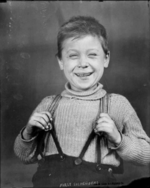 Age significantly affected the type of trouser suspension. This is basically anatomical. Younger boys do not have prominant waistlines. Thus belts are not very effective methods of trouser suspension. The youngest children for many years did not even wear trousers. Little boys in the 19th century wore dresses or other skirted garments like tunics, smocks, and pinakors that were supported from the shoulders. Somewhat older children might war button-on garments. Here garments like skirts and trousers mkight be supported by buttoning them on to garmenmts supported from the shoulders. This could be a blouse or a form of unbderwaist. American manufacturers offerd underwaists in a large range ofstles. They were also used to support long stockings. In the 19th and early-2oth century, a boy's first suspenders were a major step in growing up. It mean that he no longer had to wear button-on clothing. The age varied from family to family. Belts did not become common until after World war I. And even then, many boys did not wear them until about 10 yeas of age.