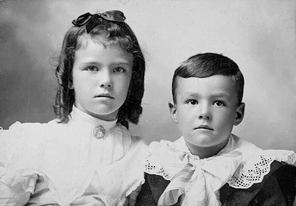 We still see the fancy Fauntlroy collars at the beginning of the 20th century, but they did not last long. The Fauntleroy Craze was coming to an end and becoming less common by mid-dedade. We see fewer older boys wearing the large white collars, although blouses with Fauntleroy-type collars, often colored, stipes, or prints were done up for boys, including younger teens. They had back flaps like sailor blouses. These were not for Fauntleroy suits. We still see large fancy collars, but not as large as in the 1890s. The collars were commonly ruffled collars. Lace collars were not very common, but the ruffled collars often had eyelet lace trim (figur1). Sailor collars continued to be popular. This primarily involved the standard V-front collar with a varieky of detailing variations. A more informal garment became poopular--tunics. They were done in various styles and a range of collars. A new collar style was the Russian blouse which was done without a collar or the bare minimum. These collars were used for both tunics abnd blouses. We see many school age boys in the late-19th and early-20th centuries wearing Eton collars when dressing up. The standard Eton collar had pointed tips. We see many different types, some with varying degrees of ronded tips, some becoming Peter Pan collars. These collars were worn with and without floppy bows. The size of the bows gradually declined as the decade progressed. This lasted a little longer. We still see wing collars and high collars, but less commonly for boys. We also notice high collars and wing collars for older teenagers and men. The Minnesota children on the previous page are a good example of 1900s collars and bows.