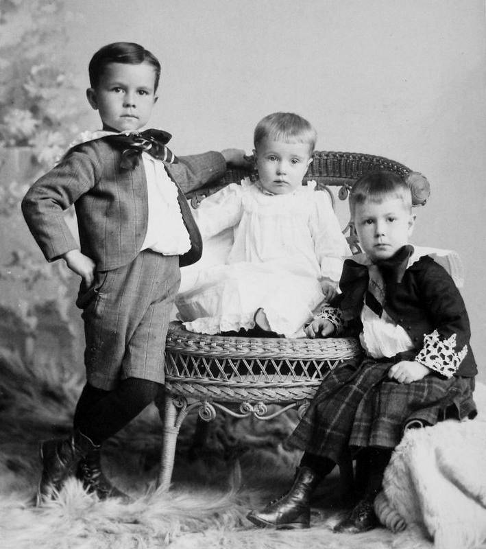 We think many boy were breeched at about 4 years of age. We begin to see more boys wearing trousers by age 5 years. This suggests that they were brreched at age 4 or 5 years of age. Here we not only have portraits of boys wearing trousers at age 4 and even mote so ar age 5 yeatrs. Even more useful are family portraits. A good examplr is Illinois family portrait, probably taken in late-1893 shows four brother. We do not know their last name, bu we do known their first names and when they were born: Leland (February 7, 1885). Sam (September 19, 1887), Wilbur (May 26, 1890), and Richard (March 31, 1892), The studio was Erikson in Rockford, Illinois. The portrait was taken February 27, 1893. This photo sugggests that the boys were breeched about 3-4 years of age. It is difficult to tell because we are not sure what Sam is wearing. We also have a New York family portrait showing boys (Horace, Malcomb, and Arthur) at ages 1-5 years old (figure 1). Of course we are not sure if Horace was breeched at age 4 or 5 years.The photographer was McNabb, a high-end Broadway studio. Unfortunately we do not know their family name, but we do know when the portrait was taken (July 22, 1894). The two yonger boys wear skirted grments, but only the oldest boy wears knee pants. While we can tell from the photographic record that many 4 year olds were breeched. Malcomb wears a Fauntlkeroy kilt suit. Arthur wears a knee pants suit with a cut-away jacket. Both boys wear black long xtockings. We are not sure just when the boys were photographed. Some may have been breeched on their birthdays, but we are not sure just how common this was.