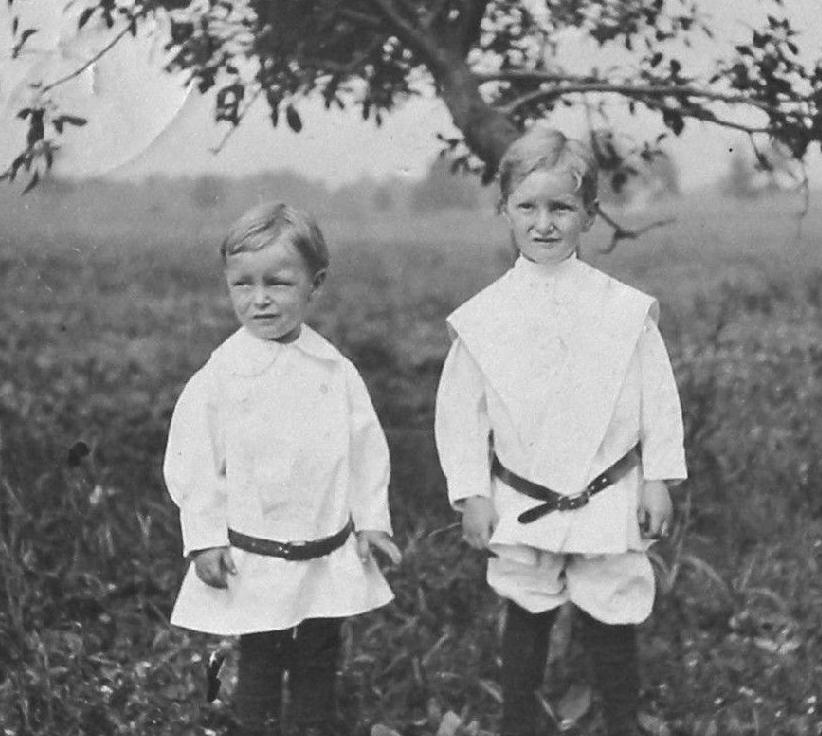 Breeching depended somewhat on the type of shirted farment the boy was wearing. Dresses and skirts were pretty straignt forward. Both boys and girls normally wore pantalettes with both these garments in the 19th century. Kilted garments were a little different. We were are not entirely sure what was worn with Highland kiltsband and varied from family to family. And in this case the boys were often already breched. This depended somewhat on the age of the boy. Highland kilts could be worn bu younger boys not yet breeched as well as older boys already breeched. In the later case it would have been just one outfit and the boy probably had suits with pants. Highland kilts were much less common in American than Scotland or even England. Klit suits were a very different matter indeed. Nowhere were kilt suits so prevalent as in America. We se them in Scotland and England as well as in other countries, but it was in America that the kilt suit became a atandad item for boys, at least middle-class boys. And here a boy may have been breeched, at least we see some boys weating matching pants ith kilt suitgs. We are not entire;y sure, however, that this constituted breeching, we have never seen any written references to it. Tunic suits were a special case at least by the turn-of-the 20yth century. Tunics by this trime were especially popuolar and were worn with bloomer knickers. Thus the boy would have been breched for this skirted garments. We are not suure, however, if these boys wore other kinds of pants besides bloomer knockers. This of course can not be derermined unless perhaps we have a family album.