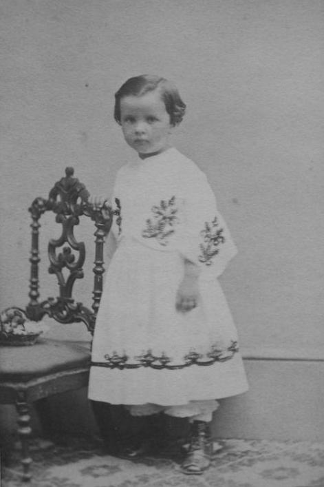 We note the characteristics of the various dress elements w have found for the 1860s. They include collars, bodice, sleves, waistline and skirt. Collars seem small. Collars varied. Some dresses do not have collars. Others have small white collars in various styles like the ones boys wore with suits. We notice both half and long sleeves. The half sleeves might cover a blouse with balloning sleeves. The little boy on the previous page in 1861 wears a patterened dress with balloned half sleeves. A good example is an Eddie S?. O'Kane? in 1865 with long sleeves. Defined waists seem common. The unidentified boy on the previous page in a jacketed dress is a good example of a defined waist. Skirts seem generally full and long, down to just above the ankles. We do not yet notice pleating.