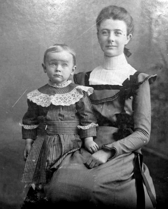 Younger boys still wore dresses at the turn-of-the 20th century, but the popularity of this convention was rapidly declining, a process which was notably observable by the mid-1890s. We see a substantial decline in boys wearing dresses at the end of the 19th century and this declined continued into the early-1900s. Most of the boys we see boys wearing dresses done in obviously boy styles. This meant fairly simple styles, although Fauntleroy trim might be added. We are unsure just why popular conventions began changing at this time and why it changed so rapidly. We think that both the popularity of Fauntleroy suits and kilt suits may have been factors. We still see boys wearing dresses in the 1900s, especially the early-1900s, but much less so than in the 1890s. They also tended to be younger boys or perhaps fewer boys from the upper end of the age group which commonly wore dresses. We notice shorter hems in the 1900s. A good example is Lincoln Muenks about 1905 who looks to be wearing a plaid dress. We also see Bert Cross wearing a low-waisted dress. He was 2 years old. Another example is Harold Howes in 1903. Another example of a younger boy is Malcomb Overbagh who looks to be abour 2 years old. We have another boy here wearing a checked dress with Fauntleroy trim and box pleats (figure 1). We notice 4-year old Wayne Mayo wearing a bright plaid dress in 1903. We are unsure about social class and demographic factors. We had thought that boys wearing dresses would be primarily from the upper class and affluent middle class. Interestingly we see a number of boys from more modest-income families wearing dresses. We think this may have been most common from rural areas. A good example is a Texas family, we think about 1905. We are not sure how to explain this.