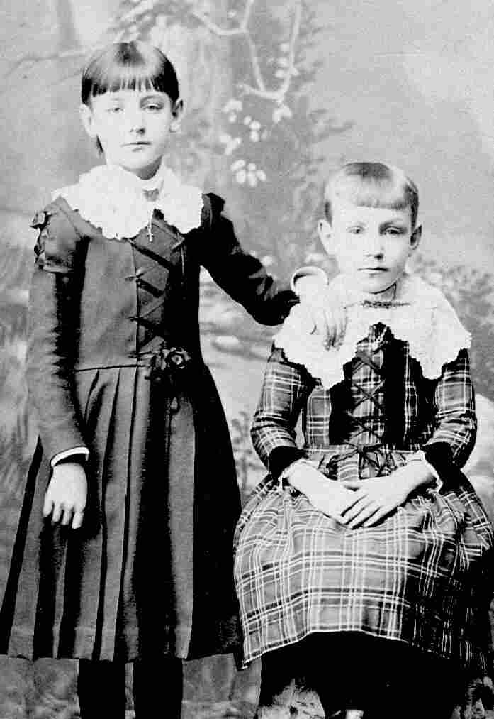 While two of the children wear dresses, each of them wear outfits with destinctive features. The boy to the right wears a standard kneepants suit with a collar rather than lapels. Not the watch fob. The kneepants fall somewhat below the knees. He wears long stockings. Were unsure about the color of the suit or stockings. The other two children wear dresses with large white scalloped collars. The collars appear to be tied on and not part of the dress. The dresses are both plain. One is a solid color and the other plaid. They both wear long stockings. The older one wears black long stockings and the other wears what look to be dark colored long stockings.