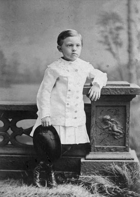 We are not entirely sure what to call these dresses, but they have details that look rather like boy's suits. The bodies are styled like suit jackets. This we are going to call the suit dresses. We welcome readers who know more about dresses to provide us more information on these drssses. Notably, we do not see girls wearing them. As far as we can tell, they seem to be a boys' dress style. They are different than kilt suits in that suit dresses are one piece garments. We notice these dresses in the late 19th century when Norfolk suits were popular. Thus we see these dresses commonly made with Norfolk detailing. The basic dresses were often made on a A-line basis although some are almost tubular with very little flaring of the skirt. They commonly had self belts.