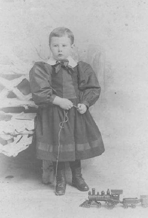 Another major stylistic element of the dress is the sleeves. We note all kinds of different sleeve treatment and styles which have changed extensively over time. Some sleeves were very simple, little different then shirt sleeves. Most were long sleeves, but we notice shortened lengths as well at a time that short sleeve shirts were not common at all. Some summer frocks did not have any sleeves at all. The shortened length sleeves varied from very short, cut at the upper arm. Other sleeves continued well below the elbow. Width also varried. at mid-19th century, wide sleeves were popular to accomodate blouse sleeves that blouced out at the lower arm. We all notice puff or baloon sleeves. Here the length varied. Often the balloning was just at the upper arm/shoulder. In other cases it extended extenivesly down the sleeve. Note the boy here with a dress that had elaborate baloon or puffed sleeves (figure 1). A problem with our assessment here is that we do not know a lot about dresses, so our assessment is largely a learning experience as we acquire information and images. We welcome readers more informed about dresses and styles to add their insights.
