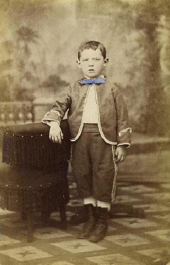 Many 7-year olds were also wearing cut-away jackets. This mean boys who for the most part had begun their eduction and wre in the second grade. We see that beginning in the 1850s, but even more importantly 1860s-70s. We see large numbers of boys in these decades in the photographic record wearing cut-away jackets. They were normally worn with knee pants, although we do notice long pants in the 1860s, especially for boys older than about 7-years. These declined in the 1880s when the cut-away jacket became part of the classic Litle Lord velvet Fauntleroy suit. Age 7 was on the upper edge of Little Lord Fauntleroy suit, a least the classic Fauntleroy suit. Older boys were decked out in Fauntleroy outfit, but using standard lapel jackets along with Fauntleroy acoutements such as blosess, collars, and cuffs along with floppy bows.