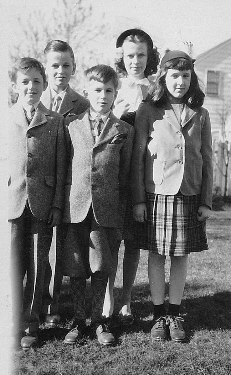 By the end of the War (August 1945) we no longer commonly see knicker suits. A reader writes, "It seems from the photo record and certain catalogs that knickers were still worn but not as often. Then after the War they seem to almost disappear." Our reader believes that knicker suits were somewht more common during the War than we do. We think that by the end if the War, especially 1944-45 that they had become increasingly a minor style. We are still working on the precise chronloy. School photography provides some clues, but for knickers in general because suits were no longer common in schools. We have a archive of 1940s school photographs. Here a factor may have been the War and the need to us fabric more efficiently. We see some boys wearing knickers in the early-40s, but knicker suits were becoming les common. We see a few knicker suits after the War, but not very many. The younger boy here wearing a knickers suit here for Easter Sunday in 1946 is an example (figure 1). By the end of the decade, knicker suits had virtually disappeared.