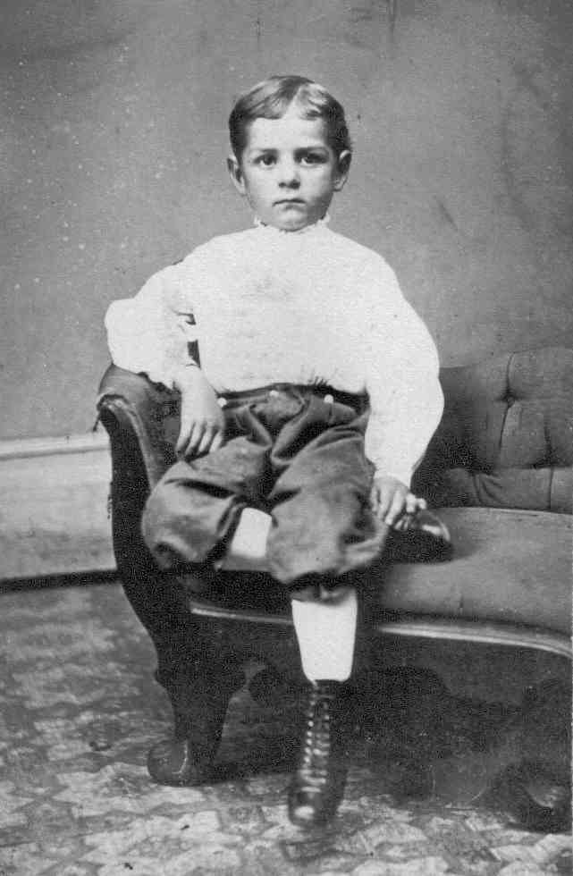 Knicker bloomers appeared in the mid-19th century. They were worn by younger boys with a wide variety of fancy jackets, primarily cut-away jackets. They were also worn around the turn of the 20th century with tunics. They were normally worn with a suit jacket, although we see a few boys wearing them just with blouses. We know realatively little about them because the suit jacket or tunic usually covere a good bit of them. We think most were made in the button-on style. We are not sure about this as we have realtively few images. Ware also unsre about the construction. They do not seem to have commonly had flys, but rather side buttons which let down a front flap. We are unsure about pocket arrangements. They were made in different lengths, both above and below the knee. The pants blouced at the knee. We're not sure if elastic or drawstrings were used.