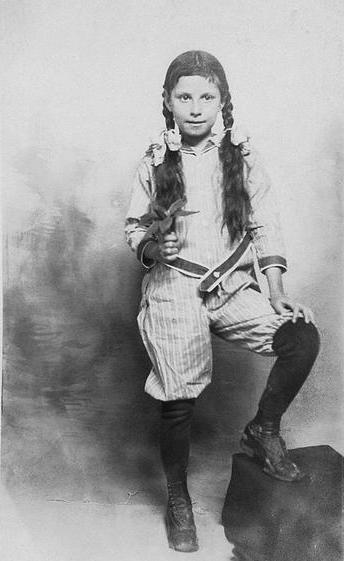We are unsure what to make of this portrait (figure 1). It is a postcard-back portrait taken about 1910. We are not even sure if the child is a boy or girl. The flower and pigtails/bows suggest a girl to us. The child's gface we think could be either a boy or girl. The garment we ar first thought was a tunic suit, which would suggest a boy. But in studying the image we don't see the tunic. It looks more like a one-piece suit, but photographs because the way fabric falls can be misleading. We don't see one-piece garments like this in the early-20th century. Pants like this which we would call bloomer knickers would be almost exclusively worn by boys. A reader suggests it could be a girl's gym suit. We think the heavy shoes rule that out. In addition, for modesty reasons, girls gym bloomers tended to be much more voluminous. A reader writes, "I remember seeing Indian braves having their hair braided like this in some movies. Of course the child here is obviously not an Indian." Schools sometimes had pagents, but boys did not grow their hair long for these presentations.