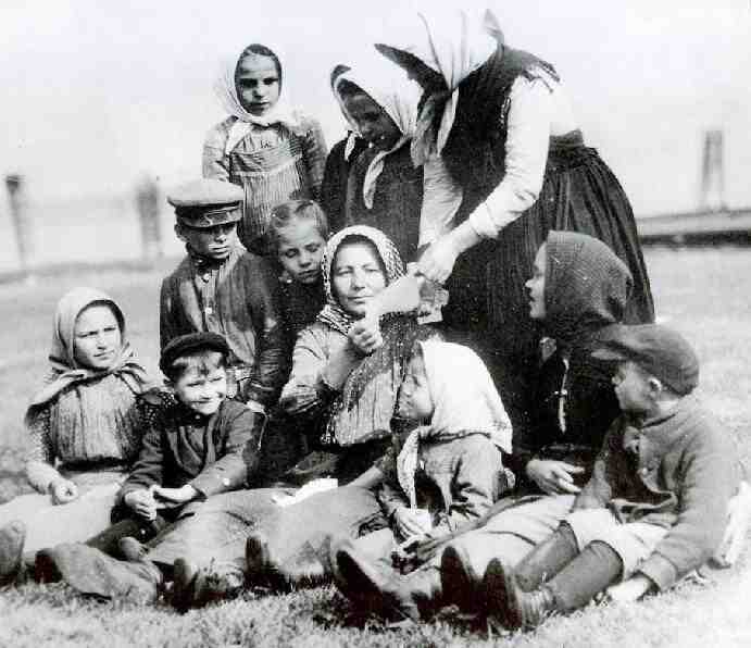The photograph here was taken on Ellis Island. It is undated but wasprobably taken in the early 20th century, probably about 1905. It shows a Czech family who posed on a lawn at Ellis Island before boarding a train to Indiana where they settled on a farm. The three small boys of the family are still wearing their European-style clothes. The head shaws were very common for women from Eastern Europe at the time. Notice that the three boys wear caps of different styles: one is a peaked cap of quasi-military style, another is a flat cap with a snap on the brim, and the third boy may be wearing a black beret (or perhaps it is also a different kind of flat cap) Two boys wear knee pants with long black stockings and high top shoes. We can't see what the third boy in back is wearing, but he is probably dressed like his brothers in knee pants and long stockings since he is only a little older
