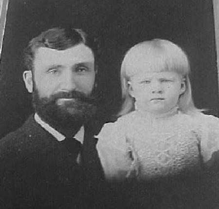 Figure 2.--The boy is seen here with his father. He looks to be about 3 years old. He is wearing a fancy white or light-colored dress. Note the long, but not curled hair. |
