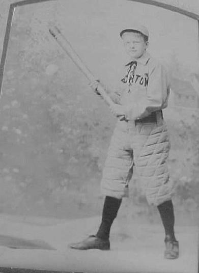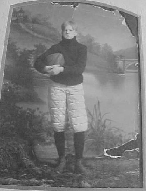 As an older boy he pppears to have been an avid sportsman, playing both baseball and football. At the time, it was not as common for boys to have sports uniforms, unless they went to a pivate school. High school sports, however, were becoming increasingly common. Here the YMCA was playing a major role. It is not possible to tell what team he played on, although his baseball shirts has writing that ends in "... ton". It could be Princeton, but he does not look old enough to be a university sudent. For football he wears a turtle-neck sweater without any writing. The baseball pants are interesting. They are padded. I am not sure how common padded baseball pants were at the time. Notably he wears the same pants for his football portrait. W believe that these padded pants were kmore common for football than baseball. Of course it may be that these were just posed portraits and he did not really play on a team. I am not sure about this. He certainly doesn't hold the bat like much of a hitter.