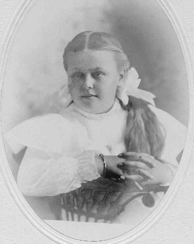 ![]() Figure 1.-- The portrait here probably taken about 1910 shows this girl wearing a dress with a night neck and pinafore-type shoulder ruffles. Is this portrait, a single portrait by herself, she does wear a hairbow. An earlier portrit with her little brother shows her without a hair bow. |