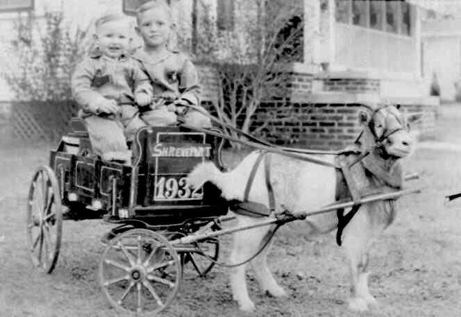 Here are the pictures I said I would send. The pictures show my older brother and I with our mother. I was born in July 1930 and my brother in 1927, so that should help giving the age of the pictures. We grew up in Shreveport, Louisana. Of course there is no doubt of the year in the picture with the goat cart and license plate. Note the picture in my bib overalls and the worn out toes of the shoes. Kids at this age usually stopped their tricycles by dragging their toes on the sidewalk. There is a of my mother and I. There is a picture of my June 1936 kindergarten graduation. I have included one more picture of my mother at age 19 mounted on a calendar. Love those curls.