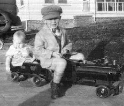 Here are the pictures I said I would send. The pictures show my older brother and I with our mother. I was born in July 1930 and my brother in 1927, so that should help giving the age of the pictures. Of course there is no doubt of the year in the picture with the goat cart and license plate. Note the picture in my bib overalls and the worn out toes of the shoes. Kids at this age usually stopped their tricycles by dragging their toes on the sidewalk. There is a of my mother and I. There is a picture of my June 1936 kindergarten graduation. I have included one more picture of my mother at age 19 mounted on a calendar. Love those curls.