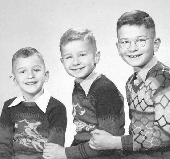 A HBC reader has provided us some images of her brother-in-law's family. There were three boys born during World War II in 1941, 1943 and 1945. Their father is a Lutheran pastor in rural Wisconsin. The boys were commonly dressed in similar, sometimes idential, garments. Available images show the boys were photographed in bib-overalls and long-sleeve striped "T" shirts as young boys after World War II. These bib-overalls and striped "T" shirts were very common throughout the United States for younger boys in the mid-1940s. One boy has a "V" symbol on the bib of his overalls. That may have been the World War II "V" for victory symbol. Cold winter weather in Wisconsin requires lots of warm clothing. A portrait from the early 50s shows the boys in colorful sweaters. The two younger boys have matching crew-neck sweaters with cowboy designs. The older boy wears a "V"-neck sweater. Note the wire-rimmed glasses that were common during the 1930s and 40s. All three boys have similar short haircuts with left parts.