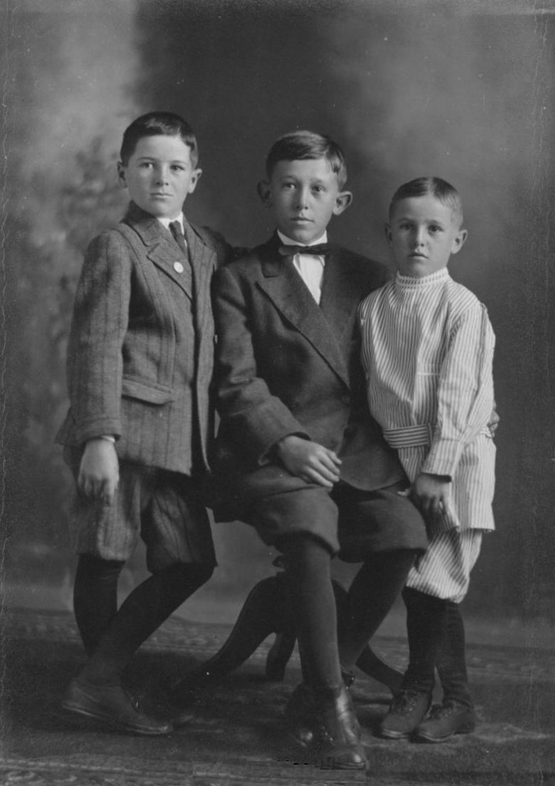Buster Brown suits and range of other tunic suits become popular after the turn-of-the Century (1900s). After World War I Oliver Twist suits become popular. Tunics were worn throughout the 19th century, but had declined in popularity during the 1880s. he tunics suits worn in the early-20th century were much more widely worn than 19th century boys. They were worn both for play as well as wehen dressing up. As the tunics and Oliver Twist suits didsappear, boys wear even outfits for younger boys become less varied and more standardized. And we begin to see juvenile Eton suits (1920s). These suits became the standard younger boy style. We see boys up to about 10-years of age wearing these Eton suits, but this gradually fell to pre-school ages. They were done with jackets that did not have lapels. While called Eton suits they could be worn with blouses that had Peter Pan as well as Eton collars. This was a style while not unique to America, was mostly seen in America. After the mid-20th century, suits began to go out of style for boys, especially younger boys. We see boys beginning to wear vests when dressing up rathr than suit jackets (1960s). Vests wee a tyle wirn by both younger and oldr boys, even teenagers. This was part of the generalized trend for informality in dress tht begn in the early-20th century. By the late-20th century many boys grew uo rarely wearing suits. Some boys id not even have one.