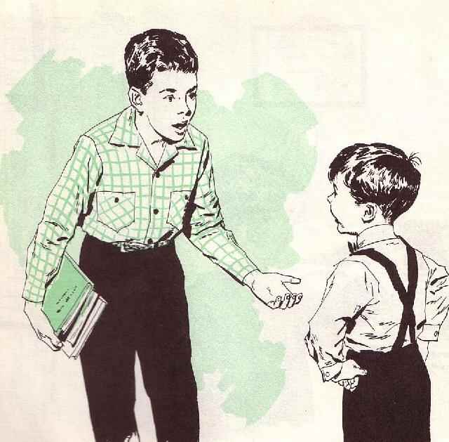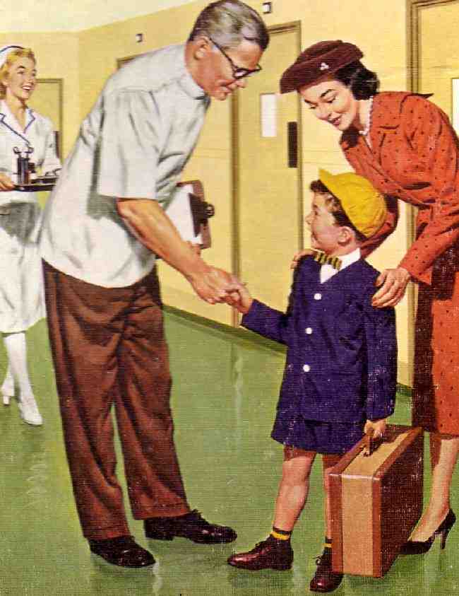 The book is a story written for children who might need to go into hospital for surgery. In this story the boy is going into hospital to have his tonsils removed. We follow him being given a reassuring talk about going into hospital by his older brother. His parents help him pack his suitcase. He goes to the hospital dressed in his best short pants suit. That might have happened in 1957, it certainly wouldn't happen today. When he arrives at the hospital he meets a boy coming out who is also dressed in the same way. He meets the doctor and smiling nurses. He is dressed in hospital clothes. After the operation the boy comes home and he finds a presents. He opens it up and finds it’s the fire truck he always wanted. The drawings illustrate the experience of the young boy’s hospital visit. This story was written to reassure children about what will happen to them in hospital. Both the child, the parents and medical personnel know that this can be a scary experience. The child knows he is going to feel pain. His mum and dad are worried about the operation and have to lrave their child behind who is suffering. They know they should be with him at this time. The doctors know that they will be able to heal the child quicker if the child is unafraid and comfortable and knows what the surgeon will do to make the child better.