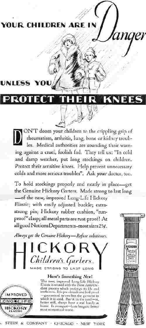 America's climate is much more severe than much of Western Europe, despite the norther lattitudes. Many American mothers did not think short pants were appropriate boys wear in cold winter weather. This advertisement for the well-known Hickory hose supporters appeared in Parents Magazine, March 1932, p. 58 (figure 1). It appealed to mothers to keep their children in long stockings during the chilly March weather rather than letting them go outdoors with bare knees. The boy and girl in the illustration are being pelted with chilly rain, apparently with unprotected knees. The mothers are being advised to protect their boys and girls from the dangers of "rheumatism, arthritis, lung, bone or kidney troubles" by keeping them during the early spring months in long stockings to "prevent unnecessary colds and more serious troubles". The advertisement even appeals to the endorsement of physicians: "Ask your doctor, too."American mothers appear to have become convinced that it was unheatlhful to expose children's knees to cold weather.