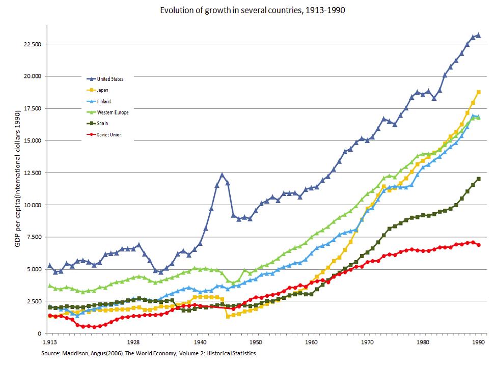 As a result of World War II and the Cold War, the Soviet Union was no longer the only Communist country. It was the most powerful Communist and controlled most other Communist countries, but there are many more socialist countries to assess. The Soviet economy after the War was presented by Soviet propaganda as a world leader. The Soviets reported strong growth numbers. Living standards did rise, but never approached those of the West. The huge growth numbers reported would suggest that Soviet living standards would narrow the gap with the West. This never occurred. Now we are not sure about the accuracy of Soviets statistics, but we do believe that impressive rates of econmomic growth probably did occur in the 1950s and 60s. But a range of factors were working against them. There were very high rates of military spending and unlike the West the scientific advances associated with weapons develooment and the Space Race were not allowed to filter down into the consumer economy. More importantly was the massive inefficency of Soviet industry. Basically the value of manufactured products coming out of Soviet factories were worth less than the value of the raw materials and other inputs going into the factories. Thus the more the Soviet economy grew, the greater the economic losses. So by the mid-1970s, the Soviet economy began to stagnate. For some time the Soviet propaganda machime manage to hide the stagnation from the outside world. As a result, the American press and Central Inteligence Agency (CIA) were surprised as the Soviet Union began to unravel (late-1980s).