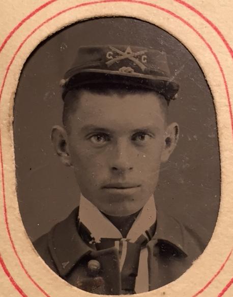 We do not know the name of this military accademy. We do not even know if it is northern or southern. All we have showing tht the school existed is a sleeved tin-type. Here we see CCA on the cap, although we are not entirly sure about the order of the letters. The boy pictures is old enough to have serve. He looks to be about16 years old. Many youth that age served. Enlisted Confederate soldiers often had very basic uniforms, often regular clothes died with grey dye or as the War progressed more commonly locally produced beech nut or acorns giving a greyish-brown look often called butternut. And few would have had badges like this. Military academies did have uniforms and badges. And grey was a commin color for cadet uniforms, including academies in the North. Even West Point had grey uniforms. The rest of the uniform looks more like an accademy uniform than an actual military uniform. The tintype sleeve helps date the image. Tintypes appeared in the mid-1850s. Early tintypes were cased like Dags ans Ambros. We see elaborate heavy embossed sleeves beginning about 1863. We are not sure when simple paper sleeves appered, but believe that it was the era just after the Civil War, Thus we would date this portrait to the the late-1860s - early-70s. This rather confirms that the portrait is of an academy pupil and not a youthful soldier. The rest of the uniform also looks more like the 70s than 60s. Hopefully readers might know what school CCA is.