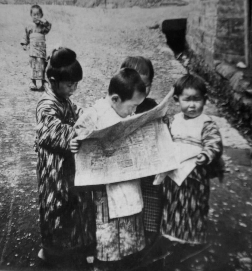 One interesting piece of evidence is a 1904 stereoscope card produced by the Keystone Company. The stereoscope was a popular item found in home parlors all across America. At the time, photographs were only beginning to be featured in newspapers and magazines. The caption was,"14061: The Mikado's loyal subjects--reading the war news." When the card was made, the War was still in progress. The children look too youing to be reading. We are not sure to what degree the photograph was staged. A reader writes, "I agree that those kids are way to young to be reading about the war so either there is a photo or a cartoon on their side of the paper or scene was definitely staged." We suspect that the photographer used the children to stage a scene he had noticed with adults. The back of the card has some fascinating information about popular attitudes. It should be remembered that this card was produced four decades before the Pacific War. It is especially interesting giving thec fact that many Japanese today believe that their country was 'tricked' into the Pacific War with America. The military of course by this time compoletely controlled the Government and strongly influences education. Yet we see very nationlist and militaritic attitudes, decades before the military seized control of ther Government.