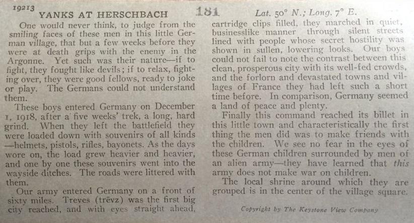 The Allied World War I occupation of Germany, in sharp contrast to the subsequent World War II occupation was limited. The Armistice (November 11, 1918) provided for the rapid withdrawl of German forces from Belgium, Luxembourg, and northern France as well as the German Rhineland. There were also restrictions on the right (eastern) side of the Rhine. The Allied occupation was basically limited to the Rhineland with a few exceptions. The occupation was conducted by American, Belgian, British, and French forces. As the Germans military crossed the Rhine, the Allied troops moved into the Rhineland. The initial Armistice was for a month. There were three subsequent prolongations (December 13, 1918 – January 16, 1919), (January 16 - February 16, 1919), and (February 16, 1919 – January 1920). The Inter-Allied Rhineland High Commission provided for by the Versailles Treaty (paragraphs 428-431) was set up in 1920. Although not occupation, a related Allied Control Commision was established in Berlin to ensure that the Germans observed the terms of the Treaty in the much larger unoccupied areas. It proved ineffective. And there was widespread disarmament evasion even before the NAZIs seized power. When the Germans failed to pay the reparations required under the Versailles Treaty, France and Belgium occupied the industrial Ruhr. The Ruhr flows into Rhine and thus much of industrialized Ruhr was just across the Rhine. To punish the Allies, Weimar authorities unleased the devestating inflation on the German people. The French and Belgians withdrew from the Ruhr (1925). There were a range of incidents between the occupation troops and German protestors. The Germans were particularly incensed about the French use of African colonial troops in the occupation. There were incidents, but they were blown up out of all proprtions by the German press. The term 'Rhineland Bastards' began to be used. What was missing in the was any willingness to recognize how limited the incidents were in comparison to the brutality of the German occupation of Belgium, Luxenbourg, and northern France. Under the terms of the Locarno Treaties (1925-26), the Allied occupation ended. The Versailles Treaty stipulated that the Allied military forces would withdraw from the Rhineland in 1935. Actually they withdrew earlier. The Americans withdrew at an early point (1923). The British convinced the skeptical French to do so. The last British troops left (1929). The French troops completed their withdrawl (1930). The Saarland in the southern Rhineland was an exception and a separate provision of the Versailles Treaty. The French had hoped that they could convince the Saarlanders to become part of France. The Saarlanders which quickly became NAZIfied, howver, voted in a plebecite to return to Germany (1935). Even after the Allied withdrawl, the Versailles Treaty required that the Rhinelnd remain demilitarized. Hitler unilaterally remilitarized the Rhineland (1936). While a violation of the Versallies Treaty, the Allies only submitted a weak protest.