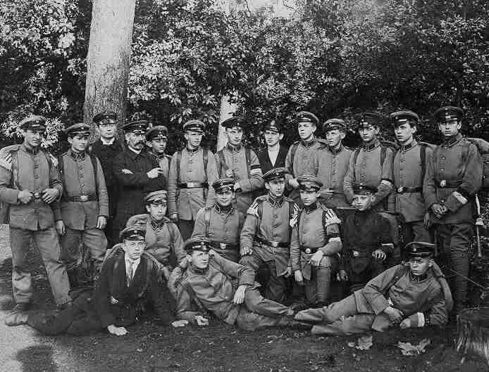 We note student groups that seem to be involved in some sort of cadet groups. We do not know if Germany had a system of school cadets. Cadets werev not necasrily from military schools, but rather regular schools where the students did some military training, like Reserve Officer Training Cirps (ROTC) in America. Their teachers seem to be involved in leadership roles. We do not know just what the groups represent and to what extent they actually involved the students with military training. We notice uniforms on some school groups. Here we see what looks like a school class (figure 1). Not all the boys wear military uniforms, but most do. We have the idea that this is some sort of training exerise. It must not have been too rigorous as some of the boys are wearing suits. Hopefully some of our readers can give us some insights into these student groups. Germany had military schools, but a relatively small number of boys attended them. We do not have much information on German World War I conscription or if there were student defereements.