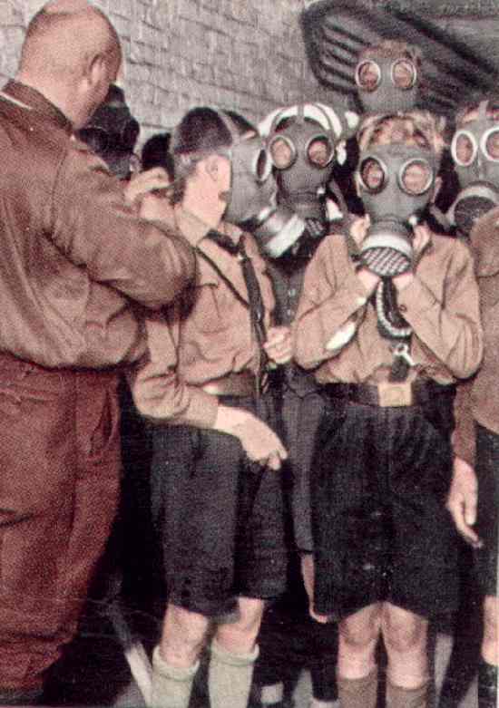Germany had chemical weapons. The weapons were outlawed by the Versailles Treaty following World War I (1919). The German military had a range of programs to evade the Versailles limitations. I am not sure to what extent they worked on gas weapons during the Weimar era. After the NAZIs seized power (1933) the Germans launched a chenical warfare program and by the start of the War (1939) had substantial stockpiles. Unlike other weapons system, however, Hitler who had been gassed during World War I did not look favorably on gas weapons. I have no information at this time on German policy discussions concerning gas weapons. One German source indicates that military and chemical experts discussed the possible usde of chemical weapons in great deail, especially the use of gas in aerial warfare. The Germans seemed to have concluded that it wa not a very effective military weapon. [Rumpf, p. 173.] The conventional wisdom is that Germany did not need them at the beginning of the War and was afaid to use r=them once the Allies gained air supremecy. The military in Germany was issued gas masks. The Luftwaffe's superority at the beginning of the War made bombing attacks of less concern to civilians. Goering assured the public that it was not possible for the Allies to bomb Berlin. I'm not sure about the extent to which German civilians were prepared for gas attacks. We note photographs of Hitler Youth boys training to use gas masks.