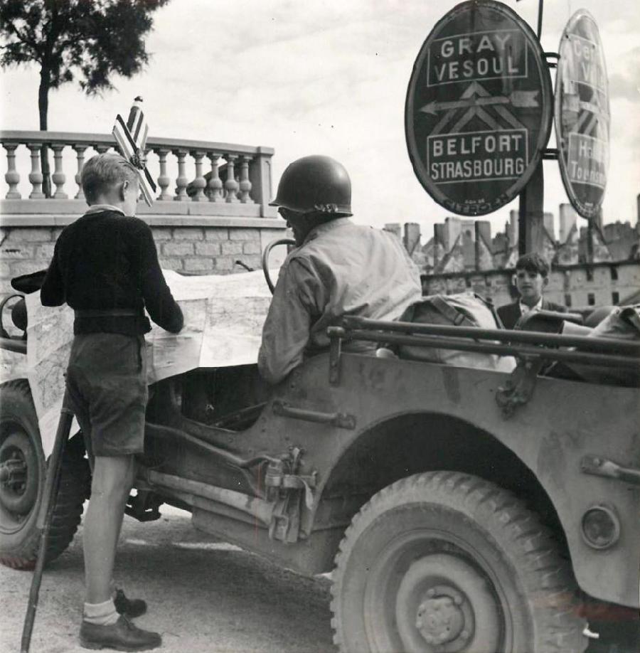 Allied Armies with Operation Cobra (July 25-26) began the sweep through France, followed closely by the defeat of the German 7th Army at Falaise, the Operation Dragoon landngs in southern France (August 15), and the liberation of Paris (August 25). Hitler's insistance on launching an offensive at Mortain doomed the 7th Army. While many Germans escaped from the Falaise pocket, they had to abandon their heavy weapons. This meant that the Germans no longer had the strength to even attempt to establish a defensine line on the Seine. German resistance only began to stiffen as the Aliies began to approach the borrders of the Reich. One of these areas was the Vosges mountains in northeastern France. The Vosges was assaulted by the Anercan VI Corps of the United States Seventh Army commanded by Lieutenant General Alexander Patch. The Germans were deeply-entrenched in the Vosges Mountains. No longer retreating, the Germans were reinfrced with full strength units like the German 708th Volks-Grenadier Division. The American offensive was the first successful military penetration of the Vosges.. Other armies such as the Romans and Huns had failed. Conditions during the late fall were terrible, including rain, snow, mud, and ice. The most notable incident of the campaign was the rescue crried out by the 442nd Regimental Team of Japanese Americans. A unit of the 36th Texas Division was cut off and surrounded by the Germans. The Germans in the Vosges had not expected to be attacked by Japanese-looking soldiers. The ferocity of the fightinging is shown by an entry in the 100th Batalion's diary, "Very few prisioners were taken." [Asahina] The rescue was prominently reported by the New York Times. The accompanying picture showed one of the 442nd white officers with a rescued Texan.