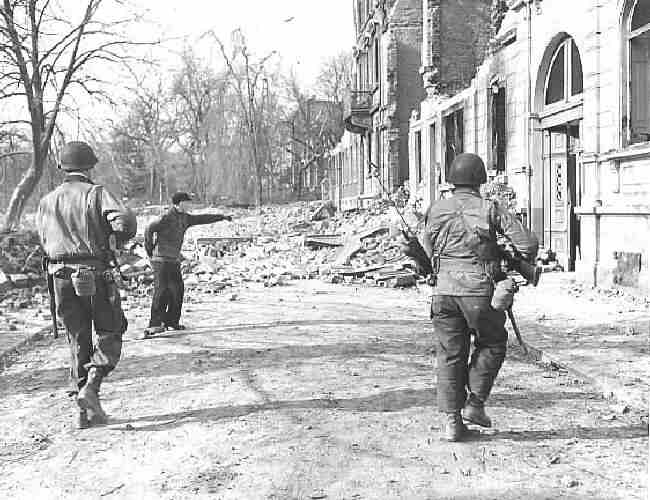 Not all German boys were determined to fight in the defense of Germany. In fact some boys cooperated with the Allied soldiers. Here we do not mean the friendly relations that developed between American soldiers and German children during the occupation. Here we mean cooperation during the fishting as Allied armies crossed the border of the Reich. Here our preconceived concept is that msany young Germns were willing to either fight the Allies in the Volkssturm or at least fearfully watched the Allies roll through German once the Rhine River crossings were forced. We do not know how common it was for German boys to cooperate with the Allied soldiers or indeed what their motivation was. This boy could be pointing out snipers his own age. We have no idea why he was doing this. Perhaps he was bribed with food. Perhaps his parents or other family members had been interened in concentration camps. We just do not know.