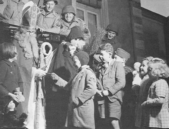 Unhapilly, Hitler was not finished with Belgians. Only 3 months after liberation, Hitler launched the last important German offensive of the War (December 16). He chose a weak section of the Allied line in the Belgian Ardennes. The Wacht am Rhein ('Watch on the Rhine') was the second German World War II offensive through the Ardennes. The resulting Battle of the Bulge was the largest ground battle ever fought by the American Army. Almost all of it was fought in Belgium at great cost to Belgian civilians. The Germans secretly ammassed tactical superority in the Ardennes and broke through Allied lines. Unlike 1940, however, they no longer had the military capacity to exploit the breakout. And the offensive exposed Germany's last remaining reserves to the superior Allied firepower. Hitler's goal in the last desperate German offensive of the War was to seize the port of Antwerp and deny the Allies the ability to supply its northen wing and to cut off the British and Canadian forces in the Netherlands from the Americans to the south. The battle would be primarily fought by the United States Army. Some 55,000 troops of the British/Canadian forces participated on the northrn shoulder of the Bulge. (British sources friendly to Montgomery give a much higher estimate.) Some 600,000 Americans participated in the fighting. The Canadian unit was the 1st Canadian Parachute Battalion, also participated in the struggle. Three days after the Germans struck, Allied Commander, Gen. Eisenhower, temporarily placed American units north of a line between the towns of Givet and Prum (the northern shoulder of the Buldge) under the command of British Field Marshal Montgomery (December 19). Montgomery commanded the 21st Army Group (British-Canadian forces) which were mostly deployed in the Netherlans north pf where the Germans struck. Hitler's vision was to cut the British off again as he has dine in 1940. The US First Army and Ninth Arm vwerev transferred to Montgomery. The Americans recall how Momtgomery's arrival in their headquarters was like Christ cleansing the Temple. Montgomery ordered Lieutenant General Sir Brian Gwynne Horrocks to move sourh from the Netherlands and block the German drive to cross the Meuse. The 3rd Royal Tank Regiment was part of a joint American-British tank force that did not just defend the Meuse. They crossed the Meuse and, with support from the Royal Air Force (RAF) halted the forward advance of the 2nd Panzer Division (Decemnber 24). Montgomery has been accused of being overly cautious and generally contemptuous toward the Americans, both the soldiers and commanders. Eisenhower's plan after stoping the Germans was to stage a pinzer movement to cut off the German salient. The Americans would strike with Patton's Third Army from the south. Montgomery with British-American force would attack from the north. Montgomery kept delaying his northern attacks, which Eisenhower had planned to begin on December 27. At the same time Montgimery renewed his demand that Eisenhower turn complete command of Allied forces over to him. Eisenhower rejected this out of hand. Montgomery had alienated American commaders beforehand, but then really damaged relations with the Americans. He claimed that American troops made great fighting men when given proper leadership! Patton is often accussed of problematic statements. Nothing he ever said was remotely close to this slap in the face. The general counterattack by Allied forces only began a week late (January 3). By which time many of the Germans had escaped the salient. Prticipating British units included the 6th Airborne Division (including 1st Canadian Parachute Battalion), the 23rd Hussars, and tanks from the Fife and Forfar Yeomanry Regiment. Other British counterattacks followed (January 4).