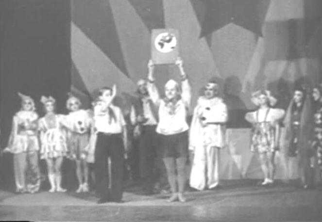 We have little information at this time as to what life was like in Latvia after the Siviets seized power, but before the NAZIs invaded. There was for a short period a air of normality. Large-scale arrests and deportations did not occur immediately. We do note a Communist theme play put on at a secondary school. The image here comes from a rare, recently discovered Soviet propaganda film made after the Soviets had invaded and taken over the government of Latvia in 1940-41. The Communists of course seized control of the schools. A play was put on for the children in the school involving a central clown-like figure (perhaps one of the upper-level boys in the school) who represents international communism controlling the entire world (figure 1). We wonder just who was chosen for thgese parts. Were these students at the school whose parents were Communists? Thie central figure has a long nose, wears an elf-like hat, and shoes with extended and curled up pointed toes. He wears short trousers and long stockings to resemble medieval tights. The placard he holds above his head is a map of the world. The boys and girls in the schools are dressed in their Young Pioneer uniforms--dark pants or skirts, white shirts, and red neckerchiefs. The play also involves a procession of the Young Pioneers across the stage after they have paid symbolic homage to the figure holding the placard of the world (click on figure 1). The boys wear either long trousers or shorts with long stockings. The girls wear skirts with long stockings. Above the waist, the boys and girls are dressed almost identically--that is, white shirts with the red neck scarves. Latvia, which had originally been an independent state, was almost totally Sovetized until the occupying Nazis (who controlled Latvia during most of World War II) displaced them. When the NAZIs were expelled at the end of the war, Latvia again became part of the Soviet regime and remained so until the end of the Cold War.