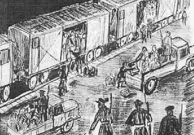 We are not sure how the deportees were collected. Nor do we know if the NKVD showed up at their door in a surprise action or if the deportees were given any advanced notice. We are unsure as to what the deportees were permitted to take with them. We do know that they were able to take some possessions. We do not know what they were limired to and how much time they were given to pack. The drawing here shows the deportees arriving with a few suitcases (figure 1). Images from the deportees after arriving at their destination shows then with bundles. The deportees appear to have been collected and driven to rail lines by open truck under armed guard.