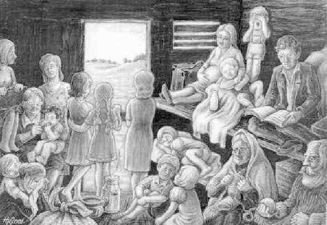 The initial years were times of great hunger and misery. I am a little unclear as to the situation and conditions. Those who were arrested lived in prison camps. Conditions there were dreadful and most died within a few much of arrival, especially during the Winter. I think but am unsure that the families lived in nearby settlements. The families at first seem to have lived in baracks and latter small cottages. The arrested individuals were involved in hard mannual labor, essentially as slaves. The adult family members despiye their skills are education were also employed in mannual labor. Presumably they were paid, but I have few details. I do not know to what exctent schools were set up for the children or at what age the young people were expected to begin working. We know that schools were operating by 1946. Deportees, however, had dificuly gaining acceptance to universities. Nor do I know to what extent the arrested individuals in the camps were allowed contact with their family in the nearby settlements.