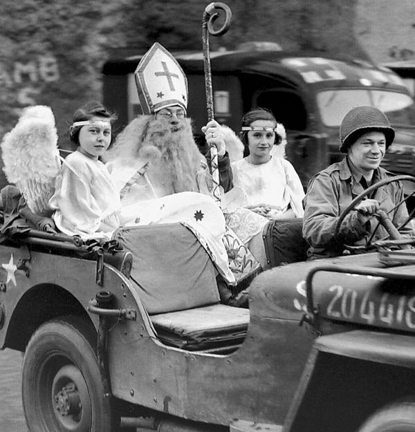 The 28th Infantry Division (Pennsylvania National Guard known as the Keystone Division) had relieved American units fighting in the Huertgen Forest. They sustained heavy casualties and pulled out of the fight to regroup and rest in Wiltz, a small town in norther Luxenbourg. The people there after 4 years of NAZI occupation had very little. They had not been able to celebrate Christmas in their traditional way meaningSt. Nicolas Day. St Nicholas was known as De Kleeschen. The Germans were engaged in a Germanization effort and there was no room for De Kleeschen. After reaching Wiltz and noticing the sad state of the own, Corporal Harry Stutz, who was Jewish, told his chum, Corporal Richard Brookins, "I think we should give this town a Christmas party. A St. Nicholas Day. For hundreds of years here in Wiltz, they had a celebration on the fifth of December, the eve of St. Nicholas Day. A man dressed as St. Nick paraded through the town and gave candy to the kids. Kids here haven't celebrated St. Nicholas Day for nearly five years because of the war. Some of them have never seen St. Nick at all." Harry contacted the local priest, Father Wolffe, who invited all the towns people. The soldiers donated candy and chocolate from their rations and even some of their gifts from home. For many of the children it was the first chocalate they ever tasted. The field kitchen baked donuts and bake cakes for the party. Just who would be St. Nicholas? Harry alreasy knew. "You, Dick! You're tall, like Father Wolffe. You can wear his fancy robes and a bishop's hat." Brookings wasn't so sure he never envisioned himself as Santa. "You've got to do it for the kids of Wiltz," Harry insisted. So Brookinns agreed to be De Kleeschen. And on the afternoon of December 5th, Brookins was taken up to Wiltz Castle which housed a convent school. Nuns giggled as they helped him dress in Father Wolffe's vestments—cassock, complete with a surplice, flowing cape with two darlong little girld dressed in white and with angle wings held for him. A rope beard tied on with a ribbon and topped by a bishop's miter completed the costume. He then was taken in a GI jeep to the town's schools. The children were enchanted. [Lion] You can see that in their faces in the film that was taken. They presented skits and songs to