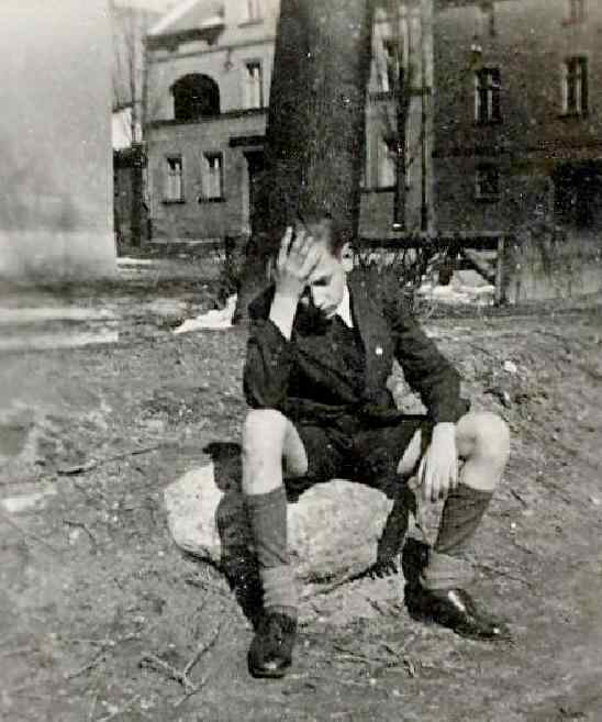 We know nothing about this photograph other than it was taken in Germany. We believe it was taken during the 1940s war years. The boy is clearly diturbed about something, but we di not know what. We can think of many things that could have affected a boy during the War, but we have no idea what may have ocurred here. A reader writes, "This is an interesting and problematic photo. It looks as though the boy is wearing knee socks with ankle socks on top. I've never seen this combination before, have you?" HBC has seen Scouts after the War dressed like this, but never a boy in a formal suit as we see here.