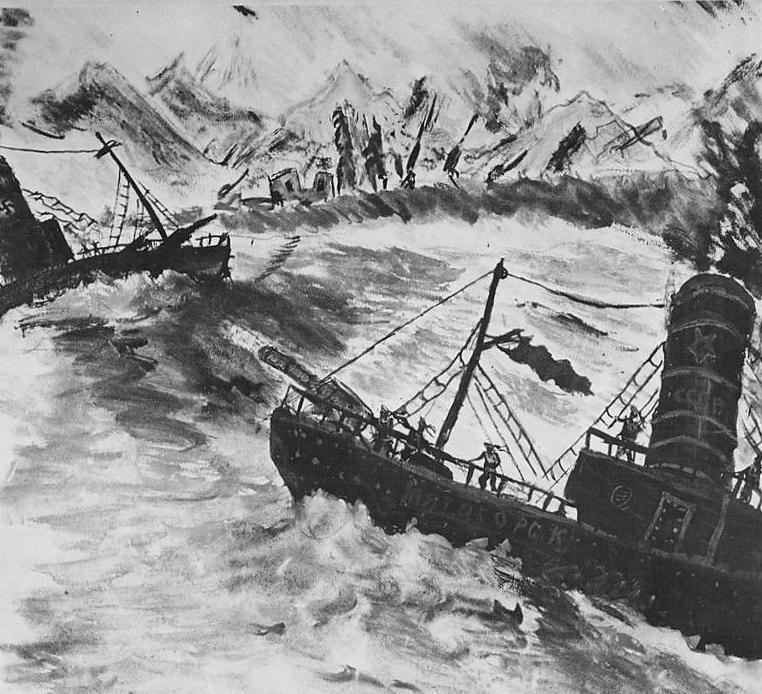 A Soviet Jewish boy produced a series of drawings anout the war. We do not know much about him. The press caption read, "Soviet Children's Art in Wartime: From Samarkand and Uzebekistan, Florida-like outposts of the Soviet Union, come pictures which mirror the life and interests of the child artist in country fighting for its existence in a total war. Apprroximately 100 of these watercolorsand drawings will be shown for the first time in this country from September 20 throug November 1 at the Museum of Modern Art in collaboration with the art Committee of the National Council of american-Soviet Friendship, Inc. . Here is a graphic presentation of 'Fighting on the Black Sea' by a 9 year old Jewish boy evacuated from Moscow. This little boy, Yulik Labas, is passionately adsorbed in the war. No other themes are portrayed in his work. His themes are taken from the daily communiques that reach him him in is far away refuge." The article appeared in American newspapers on September 20, 1944. Yulik's observations are based entirely on images he formed by listening to radio broadcasts anout the War. This of course is very different than the work of children actually caught un the fighting.