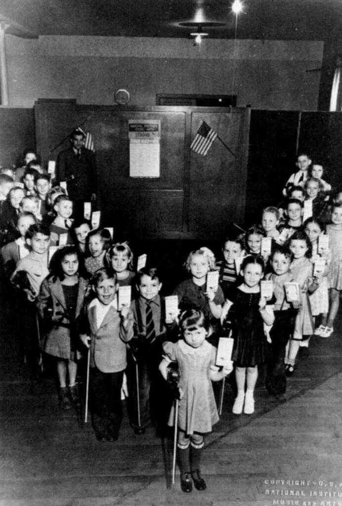 advertising and publicity ever given to any product or agency" in American history. Secretary of the Treasury Henry Morgenthau sold the first Series E U.S. Savings Bond to President Franklin D. Roosevelt on May 1, 1941. Congress chose to finance the war primarily by borrowing from financial institutions and individuals. The Federal Government launched well publicized drives to sell war bonds on a voluntary basis. The drives were supported by Hollywood celberties and decorated service men. Even children participated in these drives. They could buy Defense Saving Stamps and when they filled up their book a bond would be issued. This process began even before the Japanese Pearl Harbor attack brought America into the War (1941). There were several drives. We note a Sherman tank being used in the Third War Bond Drive (1943). The Government's financial policy also included measures to control inflation because the increased employment increased incomes at a time when the supply of consumer goods was limited. The War Bond drives not only help finance the war, but took money out of the cosumer economy and thus limited both inflation and consumer demand competing with war production. Secretary of the Treasury Henry Morgenthau sold the first Series E U.S. Savings Bond to President Franklin D. Roosevelt on May 1, 1941. The War Finance Committees sold over $185 billion of securities. By the end of World War II, over 85 million Americans had invested in War Bonds, a number unmatched by any other country. Even American children participated in the effort. Children bought Liberty stamps every week in their schools.