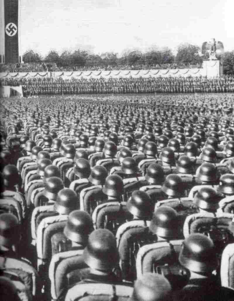 Hitler and the NAZIs planned from the beginning for a massive rearmament program. NAZI propaganda promoted the idea that Germany must rearm. [Riegler] The NAZI objectives could in fact only be achieved by war. The NAZIs did not, however, begin a massive rearmament program immediately upon seizing power in 1933. Hitler's first objective was to secure control of Germany and he did not want to precipitate foreign intervention before he was ready. The German military itself has already sponsored secret armaments programs during the Weimar era in violation of the Versailles Treaty. The NAZIs thus had a solid foundation upon which to base a revived military. The NAZIs sharply expand weapon research. The German military expanded in secret during 1933-34. Hitler by March 1935, felt sufficiently secure to publicize his military. The NAZIs announced that they expansion - which broke the terms of the Versailles Treaty. Europe learned that the Nazis had a modern 2,500 plane Luftwaffe and a Wehrmacht with 300,000 men. Hitler publicly announced that he was instituting a compulsory military conscription and planned to expand the Wehrmacht to 550,000 men. Actual armaments production began in earnest in 1936. The NAZIs in 1936 doubled armament spending over 1935 levels. It was in 1936 that NAZI arms spending first exceeded the combined total for transportation and construction spending. The nature of arms spending also increased. NAZI arms spending initially focused on research, development, and capital investment. The NAZIs in 1936 began concentrating on producing actual military equipment. This is one of the least economically beneficial types of government spending.