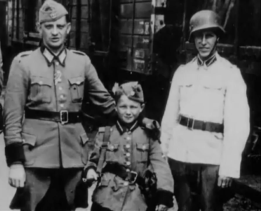 As a Latvian Waffen-SS mascot, Alex witnessed terrible attrocities. Alex saw attrocities in the German occupied areas of the East. He saw SS Einsatzgruppen killing operations beginnning with the one in his home village. He remembers one terrible action when the battalion rounded up dozens of women and children and barricaded them in a synagogue. They then set it on fire. This was the infamous Slonim massacre . Some 1,600 Jews were burned alive. Alex recounts how, "Soldiers were prodding people into the synagogue, then they hammered wooden planks across the doors and windows. They put bunches of burning sticks and branches against the building and in a flash it caught fire. The flames spread quickly and then terrible wails began. Women and children broke out, running into the road in flames. No one helped them, they burned where they fell." Those who escaped were shot by three soldiers. One of the shooters was Sgt. Kulis, the man who was protecting him. Alex tells how he was used by the soldiers. He was told to hand out candy outside transport trains. This helped calm down Jews being transported to the death camps, making them easier to handle. We see Alex here in front of some of the transports (figure 1). I do not know if he knew what happened on the other end or to what extent the men talked about it. Having witnessed killing operations, he mist have assumed thst they were being trabnsported to their death.