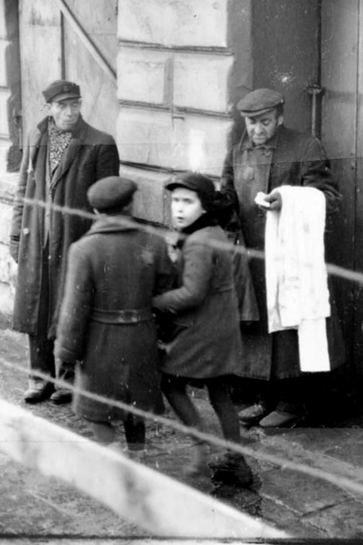 NAZI authorities, to simplify the task of identifying Jews, issued regulations requiring them to wear a yellow star armband (November 14, 1939). Friedrich Übelhör for the Kalisz-Lodzannounced the regulation, “The Jews were to wear on their right arm, directly under the armpit, with no regard to age or sex, a 10cm wide band of Jewish yellow colour as a special sign. Those who violate this order are liable to face the death penalty”. Übelhör’s order was the first such requirement issued by the NAZIs. These regulations varied within NAZI-occupied Europe, even in different areas of Poland. The order was not based on Reich law. Heydrich’s decree concerning a badge for Reich Jews was not published until 2 years later (October 1, 1941). The Reich decree did not apply to children under the age of 6 years and violations were not punished by death, but instead a fine of 150 RM or up to 6 weeks arrest. This is a good example of NAZI rule in Poland and other occupied countries. It would be conducted without any constraits, even the limited constraints that had characterized NAZI rule in the Reich itself. NAZI authorities a month later the regulation was changed to the yellow Star of David badge (December 12, 1939). Greiser the Gauleiter of the Wartheland ordered Jews to wear a yellow star of David on the chest and back instead of armbands. This affected the entire Wartheland and not just the Lodz area. It was asimple yellow star without any inscription. These badges became an important part of the NAZI Holocaust throughout Europe. This is because the NAZIs found after seizing control of Germany that it was difficicult to tell just who a Jew was. Having Jews wear badges greatly simplified this process. One child in the Lodz Ghetto explained what the Star of David meant. Jutta Szmirgeld who was 12 years old explained, "The yellow badge was a kind of stamp. A stamp that distinguished me from the rest of the population. Anyone could approach me, tell me, do to me whatever they wanted." This was because the NAZI authorities would not take action against anyone attacking or stealing from Jews even before they were enclosed in the Ghetto. These regulations continued in force even after the Ghetto was established. We are not sure about enforcement or if the regulations were modified as we see photographs from the Ghetto showing Jewish children and adults without vissible badges. Here the photographic record varies. Some show most Ghetto residents wearing the bages. Other images show more variation.