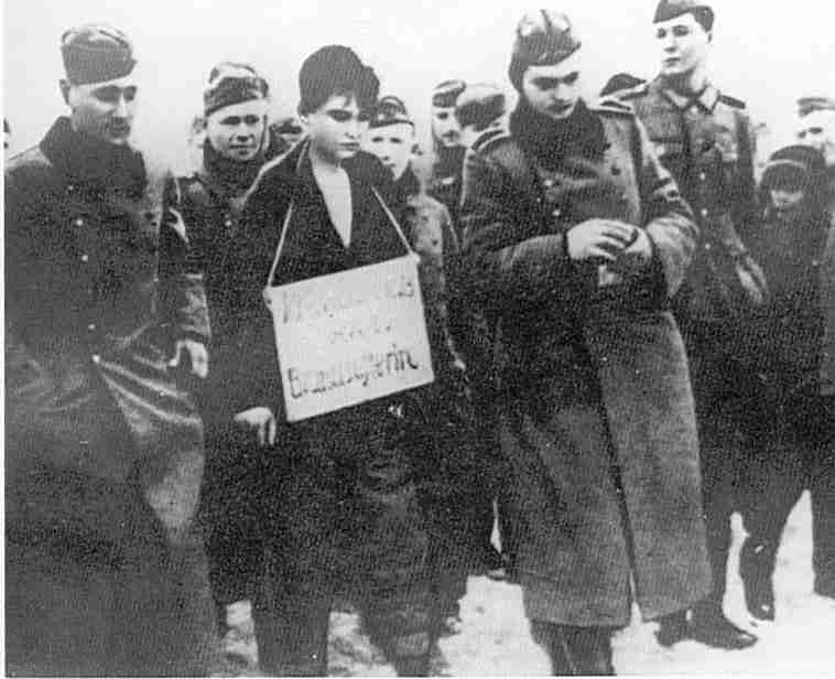 One such hero was Zoia Kosmodemianskaia. She was an 18-year old girl and member of the Moscow Komsomol. She joined the partisans when the NAZIs began what they hoped was the final drive on Moscow. She was captured by the Germans trying to burn down their stables at Petrischevo, a villasge near Moscow. She was tortured, but did not reveal any information. She was then hnged (November 29, 1941). Here we see German soldiers escorting her to the gallows. She told one of them, "You can't hang all 190 million of us." What Zoia did not know was that the NAZIs planned to kill a subsantial part of the Soviet populastion and was developing efficent methods for killing and sterilizing people in massive numbers. X=Zoia was executed just a few days before The Soviet Winter offensive which would prove desestating to the German forces trying to take Moscow. Zoia's frozen body was recovered when the Red army retook Petrischevo 2 weeks later. The nose the Germans used was still sround her neck.